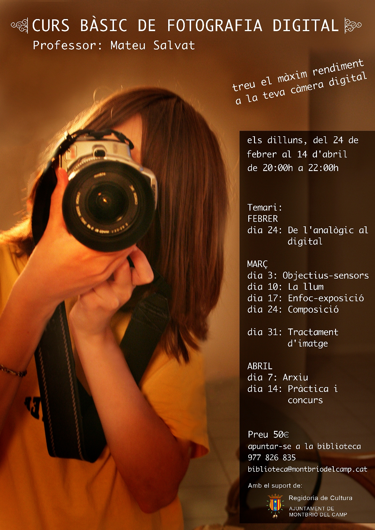 Per començar, un CURS BÀSIC DE FOTOGRAFIA DIGITAL, a càrrec del Mateu Salvat, del 24 de febrer al 14 d'abril.