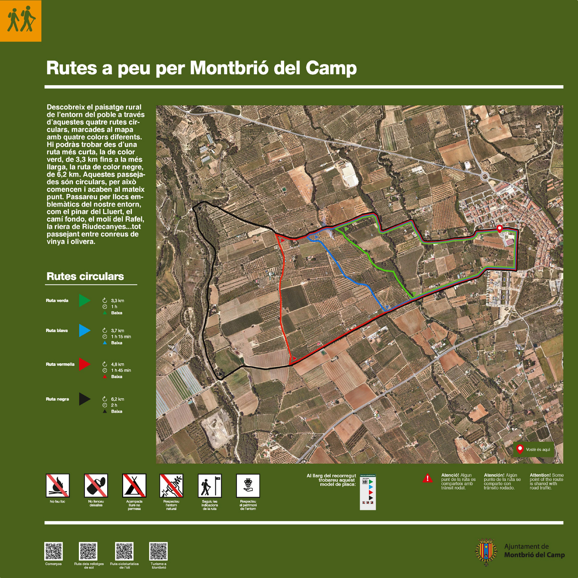 Distàncies: Ruta verda > 2,73 km Ruta blava > 3,2 km Ruta vermella > 4,3 km Ruta negra > 5,8 km |